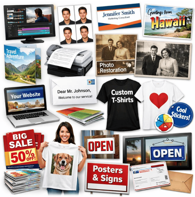 Comprehensive marketing tools including passport photos, profile photos, flyers, business cards, postcards, brochures, signs, copies, websites, old photo scanning and recovery, mail merge, t-shirt printing, stickers, video editing.